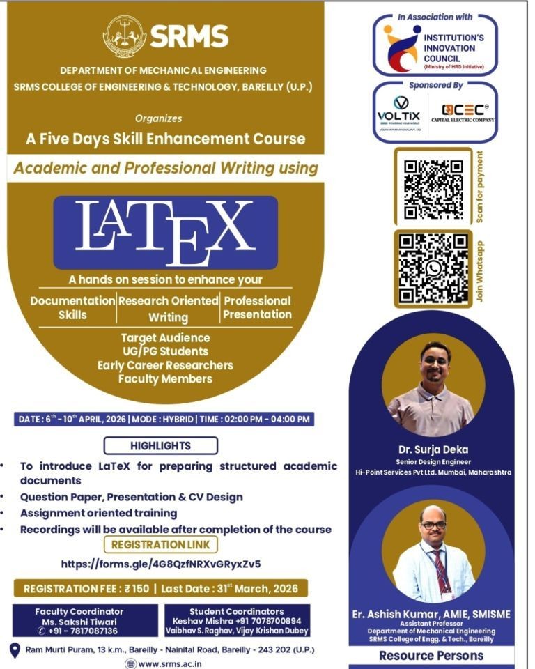 The Department of Mechanical Engineering at SRMS College of Engineering and Technology (CET), Bareilly, in collaboration with Institution’s Innovation Council