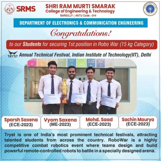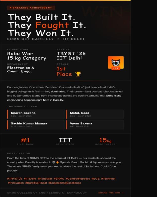 NEWS & EVENTS FROM BAREILLY to IIT DELHI: SRMS ENGINEERS DOMINATE ROBO WAR & TAKE HOME #1 Posted by admin March 18, 2026 On March 18, 2026 When SRMS Builds, India Notices: 1st Place at IIT Delhi’s Robo War…
