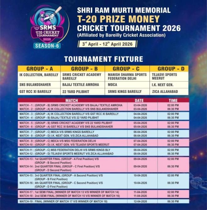 Organised by SRMS Trust in association with Bareilly Cricket Association, the action unfolds from April 3–12, 2026 at SRMS Cricket Stadium (at SRMS College of Engineering & Technology, Bareilly)